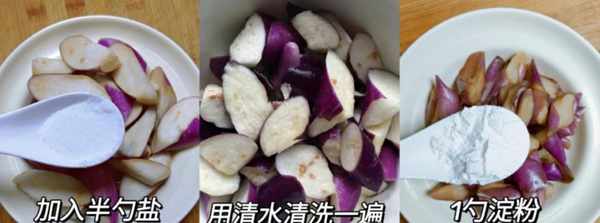 3:茄子块放在碗中,加上半勺食盐,用手抓拌均匀,腌制10分钟左右,食盐可以杀出里面的水分,加上一勺淀粉,让茄子表面包裹住淀粉,备用。