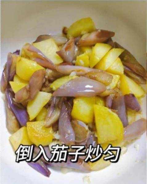 7:还可以加上一丢丢食盐和其他佐料,大火收汁,出锅,这道家常版茄子烧土豆就可以开吃了。