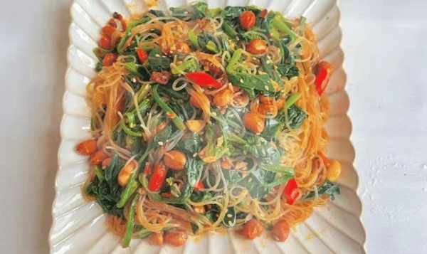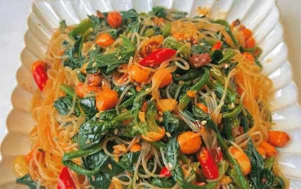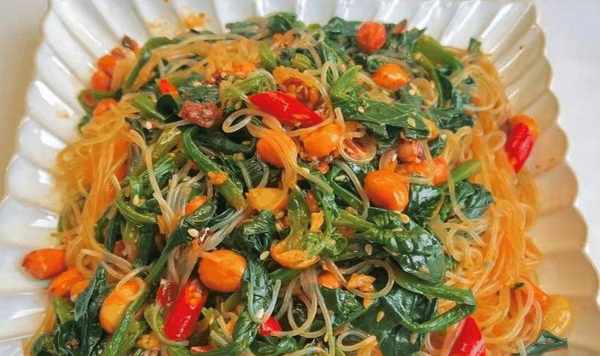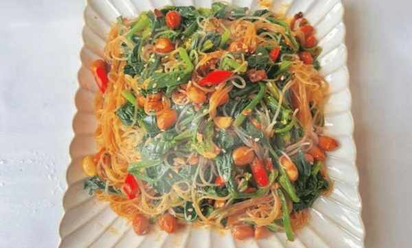麻辣菠菜花生拌粉丝是一道很适合下饭的凉菜。成本不高,配方简单。该菜营养价值全面,含有丰富的钙、铁等多种营养成分。只需将其混合即可煮熟。吃起来很开胃,满足了没有胃口的家人,早吃早受益。