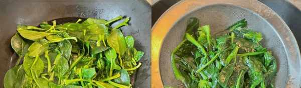 第三步:锅底继续烧开一些水,加入菠菜焯水,加盐和油,颜色更翠绿捞出沥水。
