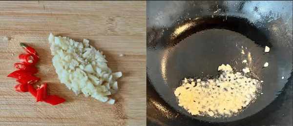 第四步:少许小米椒切段,蒜头去皮切碎,锅底加入少许食用油,加入蒜末炒香。