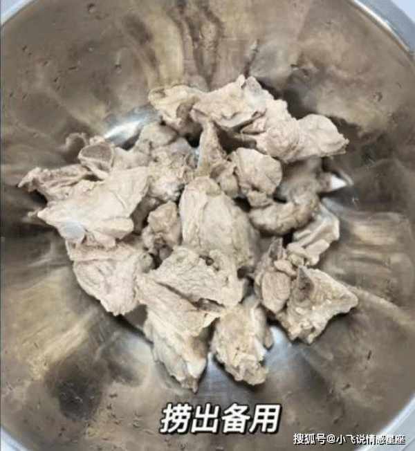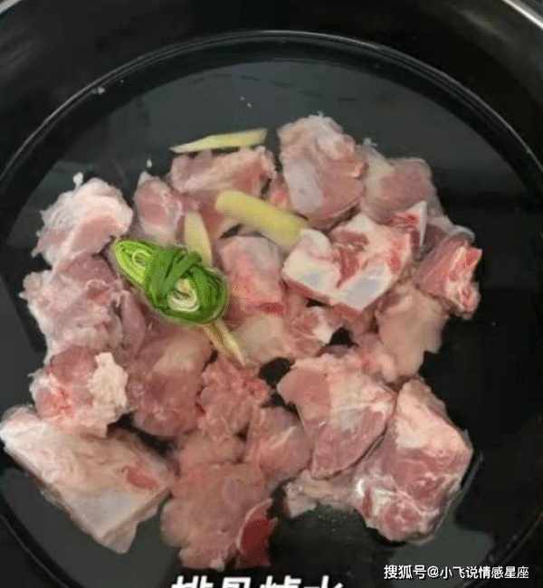第五步:将排骨放入汤锅中,相应加入姜片和葱结,加入适量清水大火烧开,别忘了加少许料酒,排骨去腥,取出它们,清洗它们。用清水冲洗干净备用。