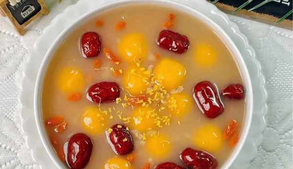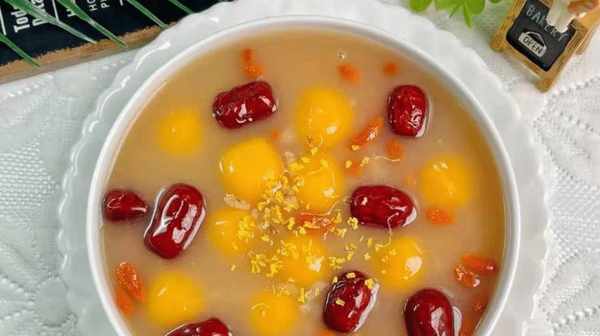 第二:做一个南瓜小麦粉球,放在面团旁边。如果实在吃不下,可以放冰箱里。汤中加入几颗洗净的红枣,加少许黄酒同煮。
