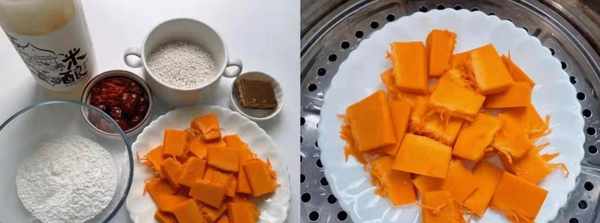 食材采购:准备全麦面粉200克(颜色一定要是白的,很干),适合米饭的酒,小南瓜(南瓜是从一个老南瓜上拆下来磨碎的),9个红的,适合的。枸杞、红糖、小桂花、水等。
