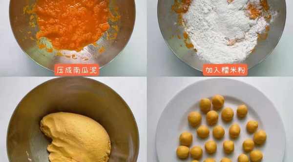 第一步:将南瓜从锅中取出压碎,放入大一点的容器中,加入200克甜面粉,加入少许热水,将面团揉匀,分成小团。
