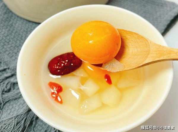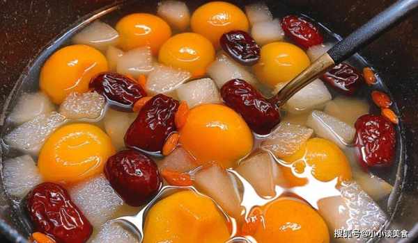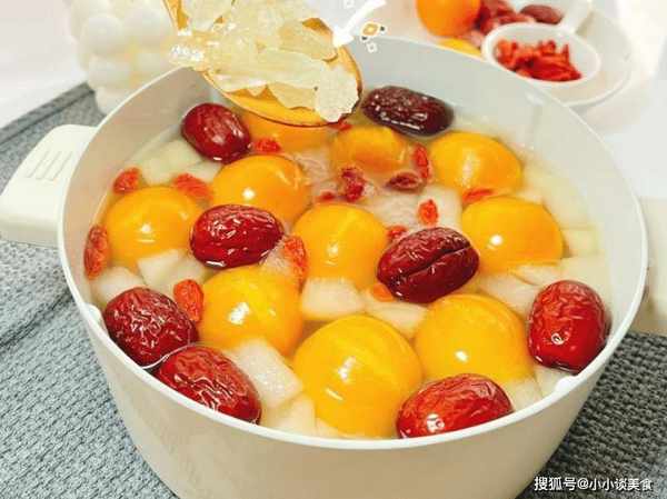 第六步:最后加入少许冰糖,用勺子不断搅拌,让冰糖完全融化。最后加入洗净的枸杞继续小火煮几分钟。第7步:将其放入碗中或放入密封罐中。秋冬千万不要错过这道汤。