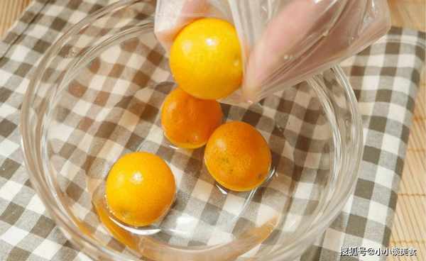 第一步:准备要用的水果。将金橘全部放入一个容器中,加入适量的水,加两勺盐,浸泡一会,然后用布擦洗,去除金橘表面的有害成分。