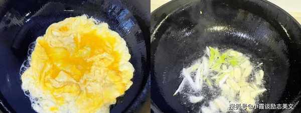 第六步:锅底预热片刻,倒入蛋液至凝固,鸡蛋煎至熟,锅底留少许油,放入葱姜蒜炒至香。