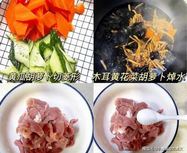 原料准备:买胡萝卜半根,青黄瓜一条,黑蘑菇15克,百合10克,新鲜瘦肉250克左右,盐少许,料酒适量,蛋清适量生粉适量,蒸油适量,水适量,土鸡蛋两个,葱、小红葱适量,蒜几瓣,料酒一匙,生抽半匙,老抽一匙,少许盐和糖,一小碗水淀粉,少许香醋,鸡精和少许香料,其他调味品。