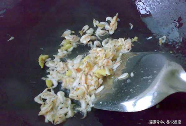 第四步:锅底烧热,加入油、蒜头、姜末和干辣椒,快炒至蒜头爆香,加入少许海米炒香。