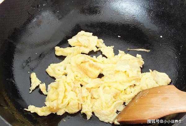 第四步:事先在锅底放少许油,待油热后,将蛋液稍微煎一下,慢慢煎至蛋液碎裂,翻炒,即可食用。.