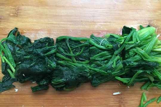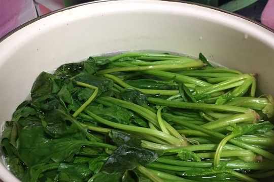 6.隨後把菠菜整根放入開水中汆燙至斷生,撈出過凉備用,整根燙菜可以更好地防止營養流失