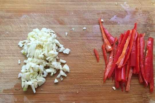 3.蒜切成碎粒,尖椒去籽切成細絲