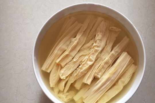 2.腐竹剪成段用溫水泡發2小時至無硬心,泡發的時候上面壓個盤子可以防止腐竹浮起