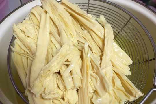 5.鍋內加水燒開,把腐竹放到笊籬上,放入開水中上下燙5秒撈出控水,這樣可以起到殺菌的作用吃著放心