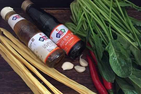 腐竹(幹)150克、菠菜200克、紅尖椒2個、味達美清香米醋20克、味達美尚品金標生抽8克、糖5克、精鹽少許、花椒5粒、蒜3瓣