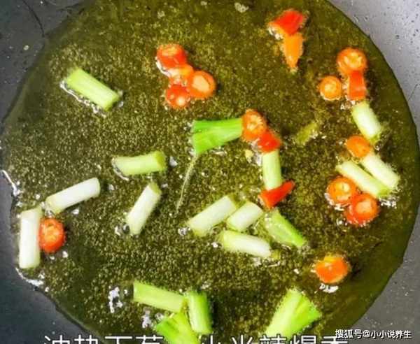 第四步:锅底加入少许色拉油,加入葱花和调味小米,快速爆香。加点酸菜和芥末,炒出香味。