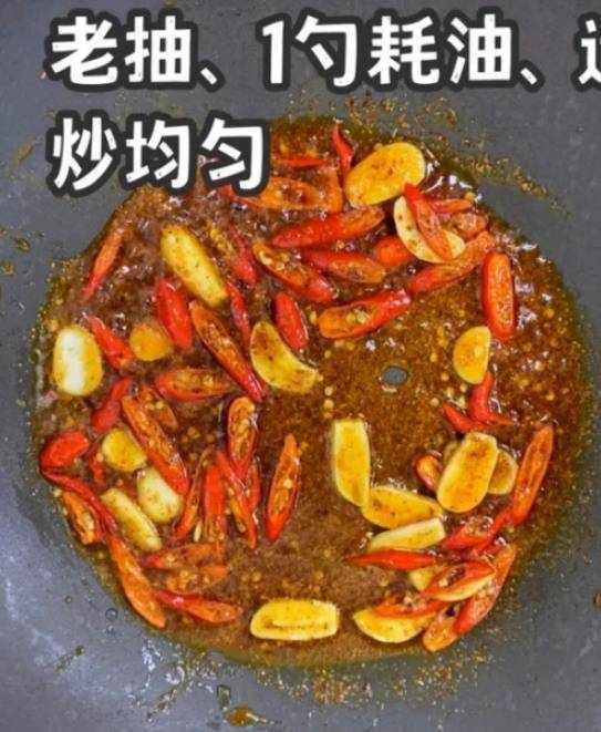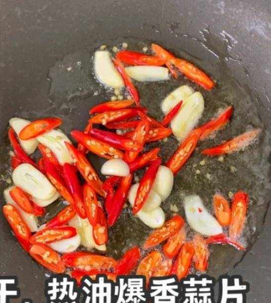 第四步:锅底加入橄榄油,放入辣椒小米和蒜片,快速翻炒出香味,加入一勺辣椒油或豆瓣酱快速翻炒片刻。