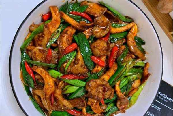 蒜苗炒平菇和剩下的猪油是我们菜单上的一道受欢迎的菜。成本不高,方法也很简单。