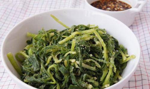 小贴士:面条是一种多年生植物,多为野生。现在在日本很普遍。叶子常用于油炸或凉拌,但叶子表面含有有害物质。叶子必须用清水洗净,然后用盐水消毒,然后调节湿度。面条要滚面粉,记得加植物油,这样面条才不会粘在一起,蒸面条需要垫底垫,上锅中火蒸,不要把面条煮烂起锅,最后调上酱汁,配上面食特别好吃。