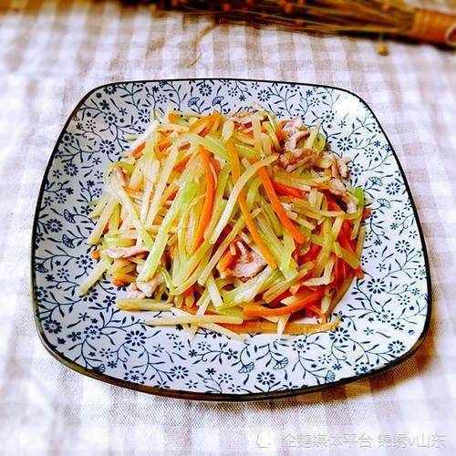 3. 热锅热油,将青红椒丝芹菜丝一起倒入翻炒;