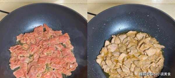 第六步:锅底加入少许橄榄油(记得用冷油热锅),倒入一些牛排片,调高火搅拌至变色,捞出备用。
