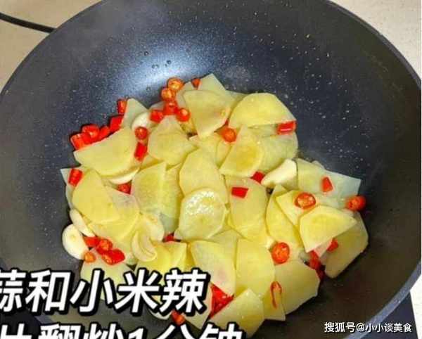 第七步:锅底留少许油,放入腌好的辣椒粉和小米辣椒粉,放入蒜片若干,大火炒香,加入土豆片翻炒片刻。