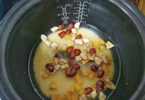 第三:红枣洗净对半切开,红枣挖去核切小块,将小米、南瓜、红枣放入炖盅内,锅中加入适量清水,放入放火上煮小米粥,然后转小火慢炖。
