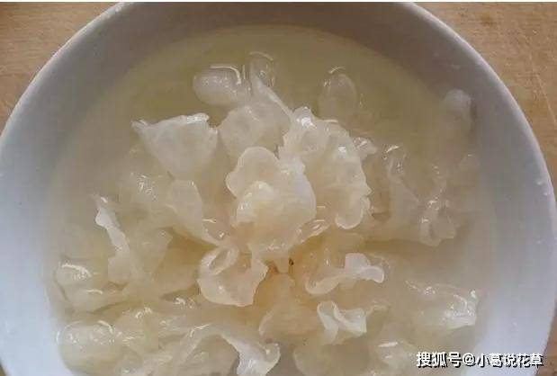 第三步:将60克雪菇放入碗中,加入适量清水,将雪菇泡软,撕成小花。将雪菇用温水浸泡半小时,这样更容易煮雪菇。