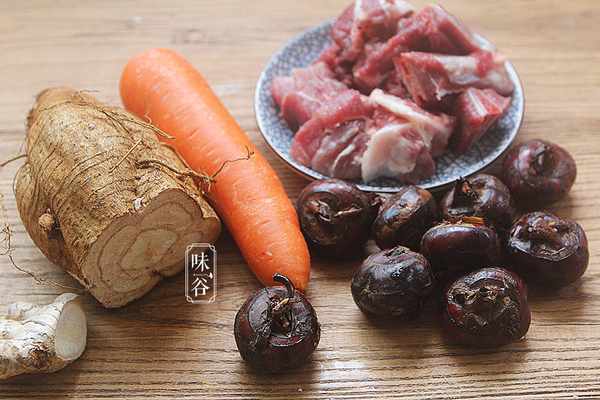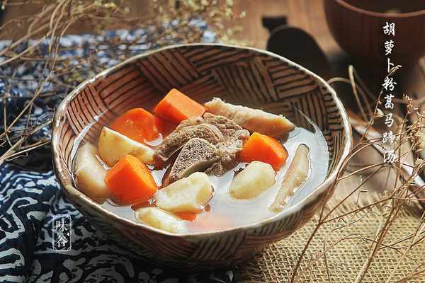 【食材】:粉葛 500克、胡萝卜 1根、猪骨 适量、马蹄 8个、姜 2片、盐 少许