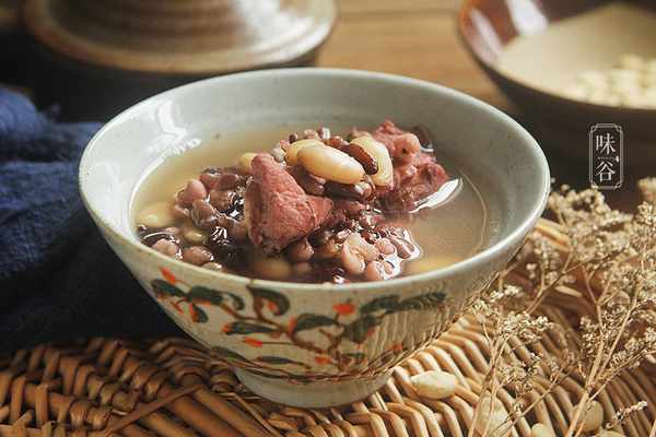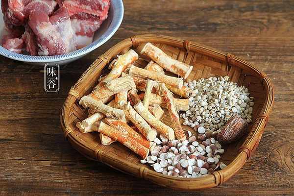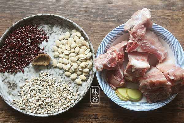 【食材】:薏米 30克、白扁豆 30克、姜 2片、猪骨 适量、赤小豆 30克、盐 1小勺、