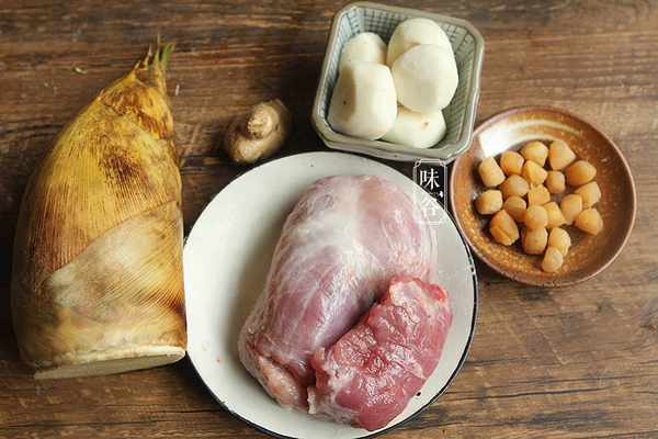 【食材】:干贝 25克、马蹄 6个、猪腱肉 适量、春笋 适量、食盐 1小勺