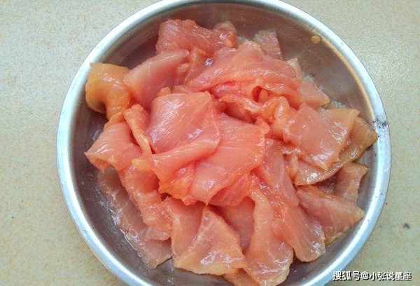 第一步:准备几样食材,小瘦肉洗净,瘦肉横纹切成薄片,所有肉块放入碗中,少许盐,少许胡椒粉,加少许料酒,最后加入.生的。抓粉几次,最后倒入食用油,这样肉块不粘锅,肉块特别嫩。