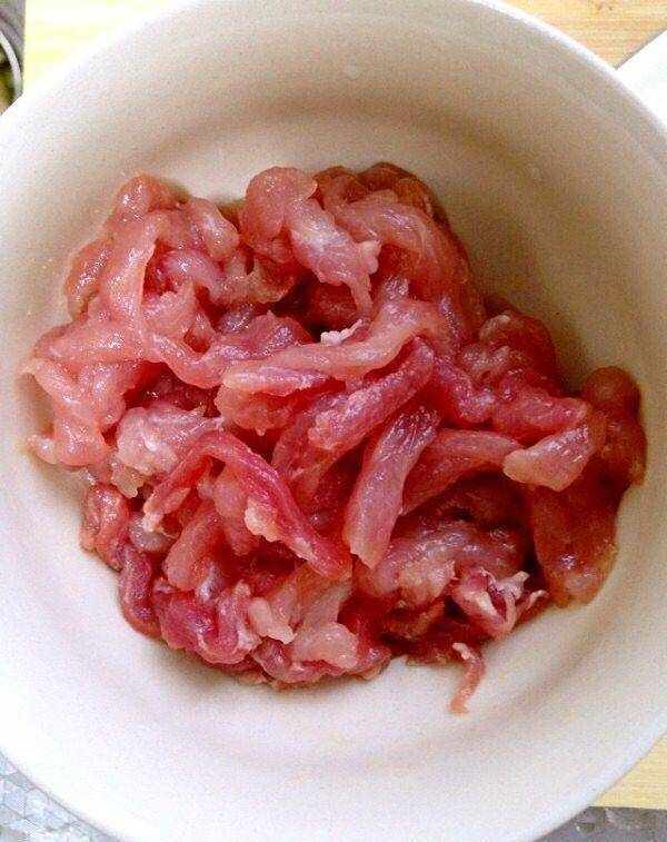 第二步:猪肉洗净,将猪肉切成几片薄片,将肉片放入碗中,加入少许淀粉、少许生抽、少许胡椒粉使其粘匀,最后滴上食用油以有效锁定它。他们以肉丝为食。