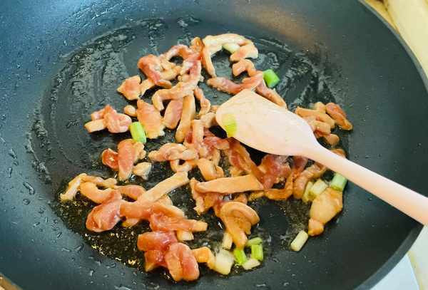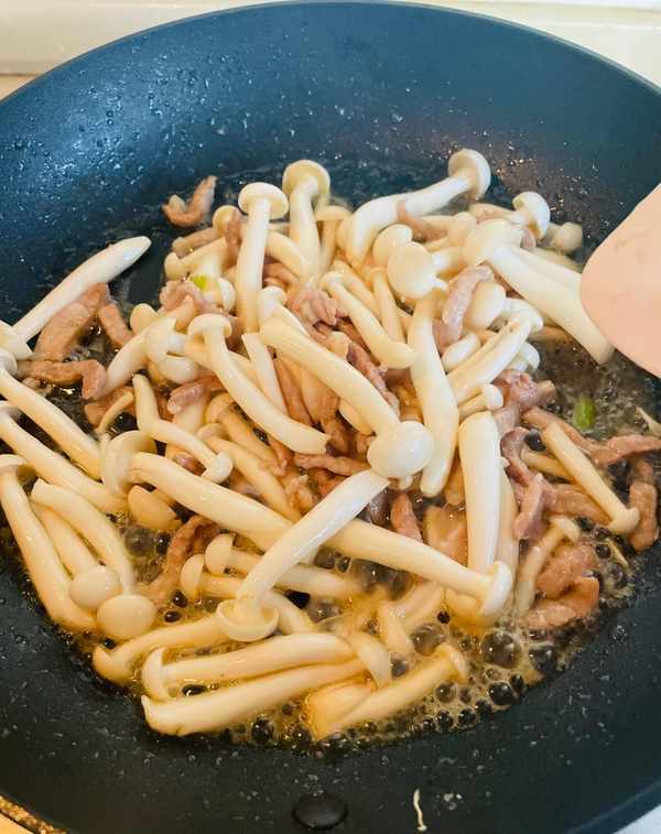 第五步:加入适量的生抽和老抽,倒入白玉菇一起炒,吸去猪肉的部分油脂,加入极鲜的味道,翻炒片刻,即可加一点辣椒酱。