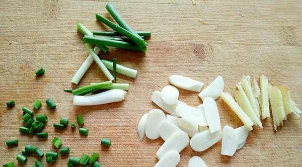第三步:小葱切根,小葱切小块,蒜切片,姜切条,白玉菇沥干水分,猪肉片腌入味。
