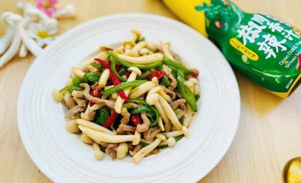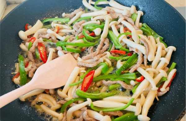 第七步:加入适量鸡精和味精,加水淀粉勾芡,收汁起锅翻炒。这道新鲜爽滑可口的青椒白玉菇炒瘦肉片就做好了。