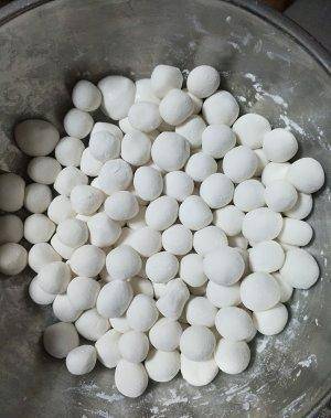 第二步:把所有的面团分成小块,揉成一些小汤圆,放在干燥的容器里,撒少许面粉防止粘锅,放入冰箱冷冻,这样就可以了随时带走它们。