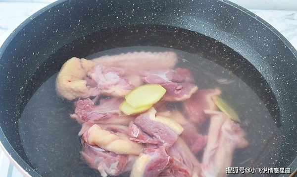 第二步:将老鸭块放入锅中,加入足够的冷水,加入几片姜片,少许料酒,开大火将老鸭块焯一下(主要是去除腥味),然后捞出.氽水表面浮上泡沫。浸入冷水中漂洗,检查水分后备用。