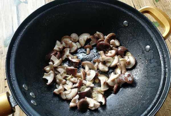 第四步炒菜:锅里倒入少许食用油,油稍微烧热,放入少许蒜头翻炒,然后倒入焯好的香菇,将香菇捞出沥水。