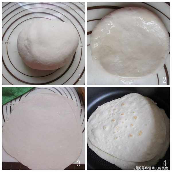 3,平底锅烧热,放上擀好的薄饼,一烙就会鼓泡,这样的薄饼才是最好吃的。