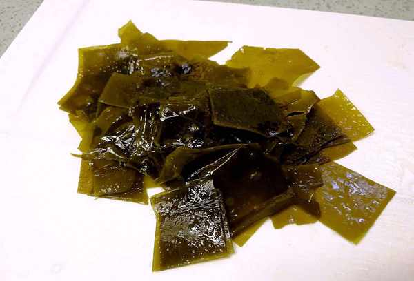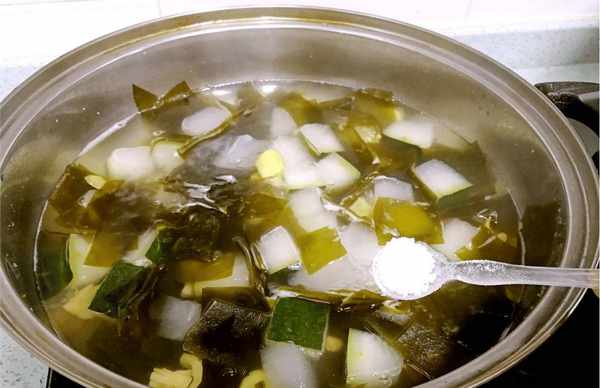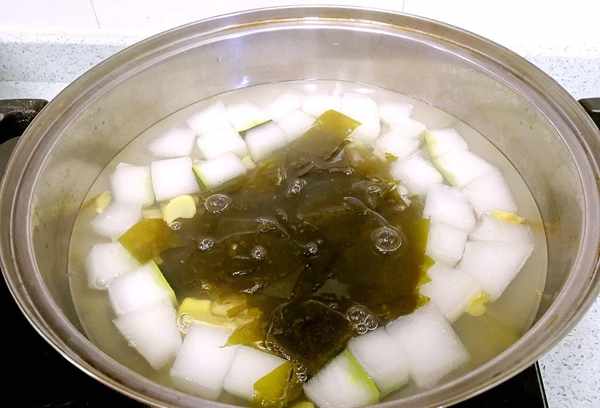 第二:等汤香了,加入一些冬瓜片,转小火将冬瓜煮至半透明,然后加入海带片继续煮。