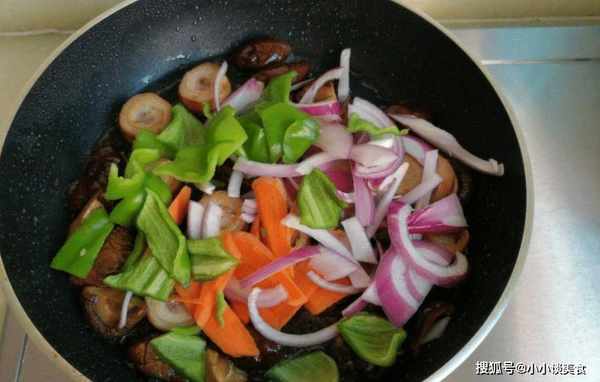 6:放入一些胡萝卜片,加入洋葱条和青椒块,搅拌至断,加入一些黑蘑菇搅拌几下,滴入一些水入锅。