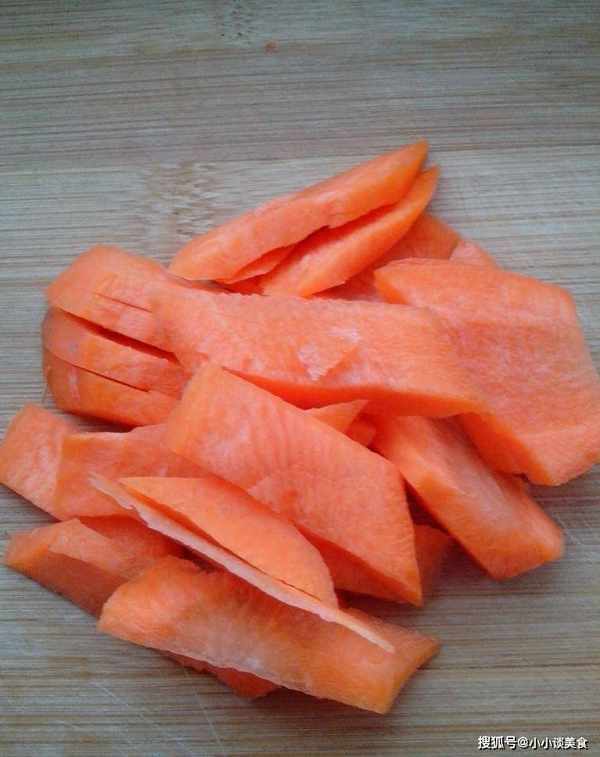 3:胡萝卜切去两端,胡萝卜去皮洗净,胡萝卜切成菱形片,烧一锅热水,加少许盐,胡萝卜焯水捞出。