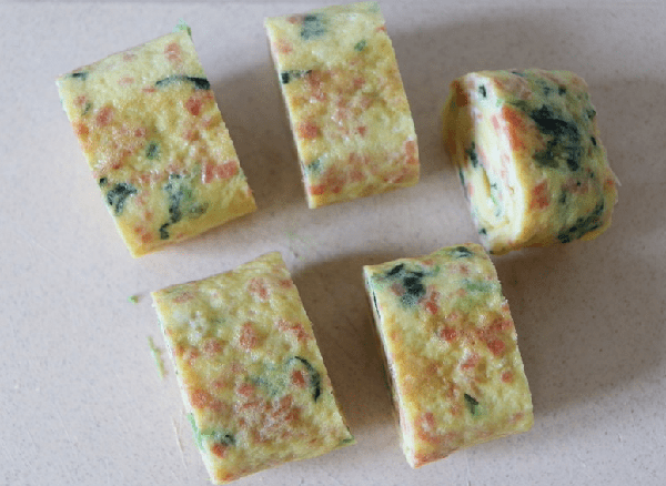 5.再倒入三分之一的蛋液,凝固后与原有的蛋卷一起卷起来。重复步骤直到材料全部用完。