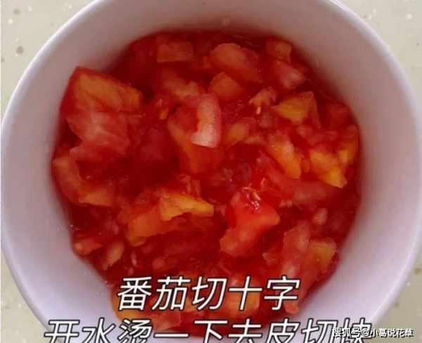 第一步:准备西红柿和日本豆腐。西红柿皮划十字,提前烧一小锅热水,用热水擦洗西红柿的手,撕开一些西红柿皮,切成小方块备用。