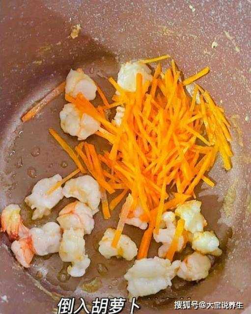 第五步:锅底继续加入橄榄油,放入虾仁炒至变色,加入切碎的胡萝卜快炒。