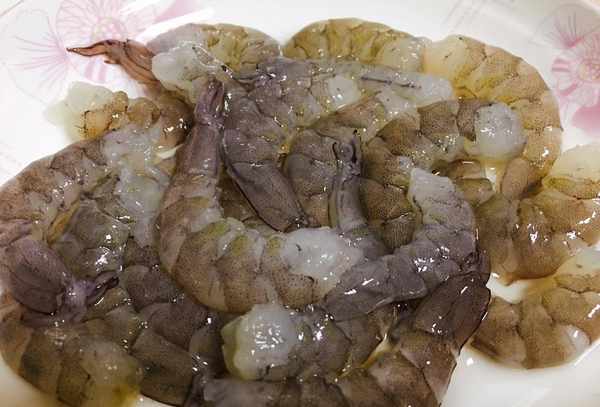 第一步:准备好各种食材,摆在盘子里。300克虾去虾线,剥去壳和头,将虾全部放入碗中。