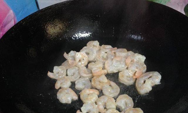 第四步:不粘锅放适量油,锅底烧热片刻,把虾全部滑入锅中,等到虾肉炸到变d颜色,让所有的虾都炸到6熟。