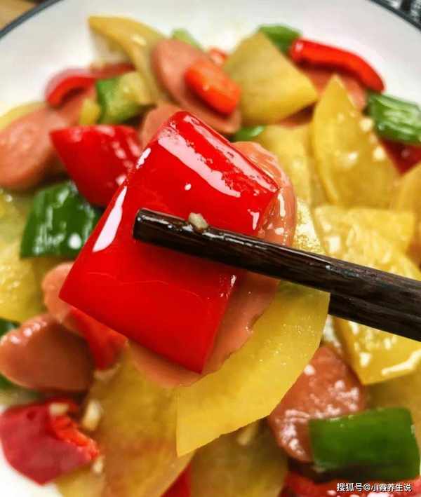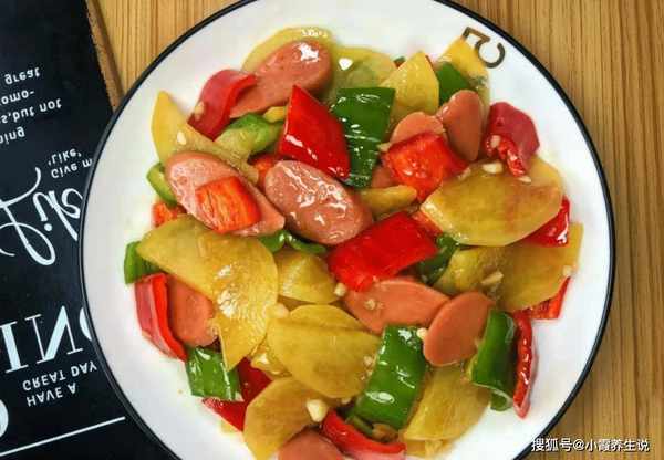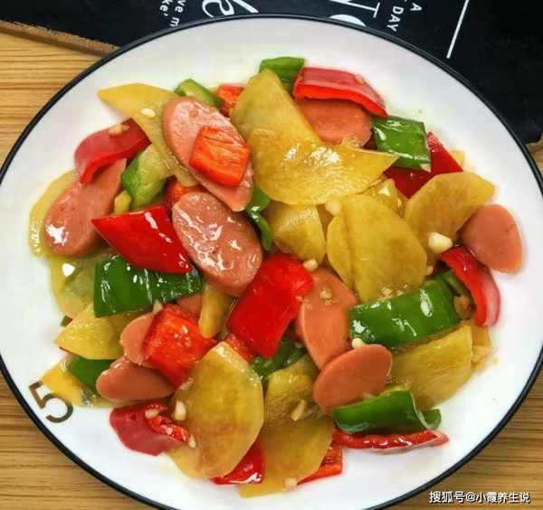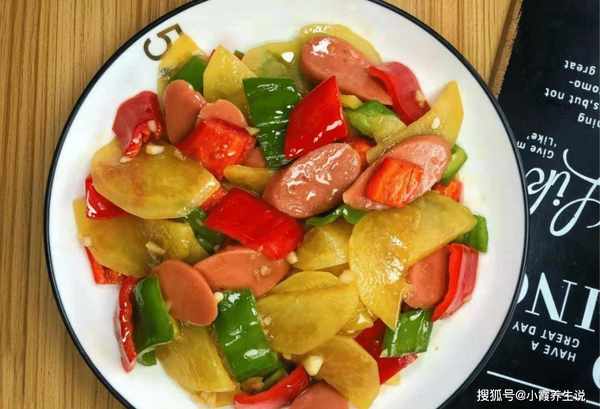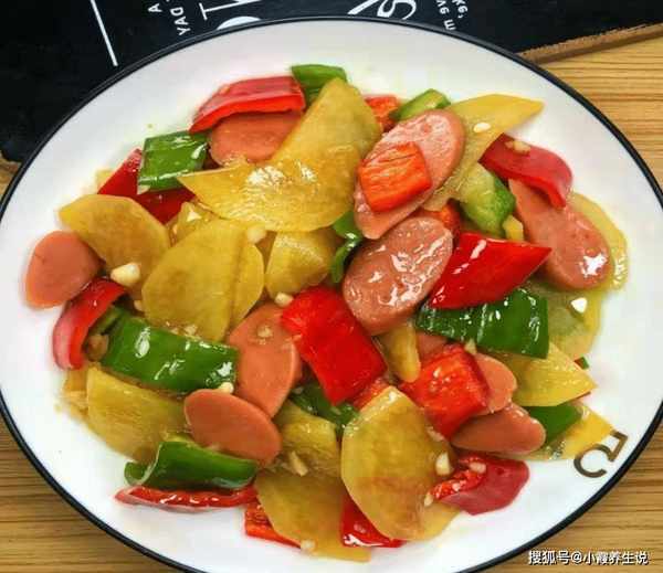 在锅中煎土豆和火腿肠。看起来好吃又好吃,简单省事。你吃过这些青红椒炸薯片吗?(所有图片均来自网络)